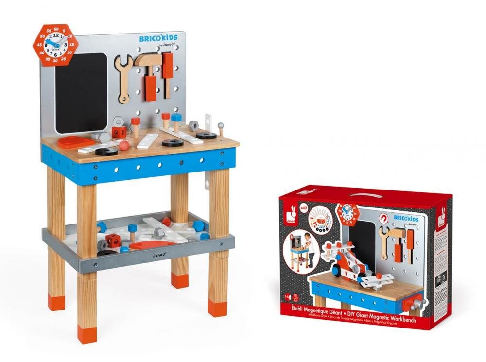 Janod dřevěný pracovní stůl BricoKids je velmi zajímavá dřevěná hračka vhodná pro chlapce od 3 do 8 let. Dřevěný stolek má lákavé oranžovo-modré barevné provedení, v balení spolu s ním najdete až 40 různých doplňků, bez kterých se neobejde žádný malý mistr. K doplňkům patří různé šrouby, matice, dřevěné nářadí, které jsou zárukou hodin plných zábavy a nekonečných možností na hraní. Celý stůl je vyrobený z masivního dřeva s jemným povrchem, plocha nad stolem je magnetická. Dřevěná hračka je skvělá pro malé kutily a řemeslníky, kteří rádi pomáhají svým tatínkem v dílně nebo kdekoliv v dome.Obsahuje 40 ks příslušenství: šrouby, matice, kotouče, podložky, svěrák, hodiny, křída a tabule, instrukční list pro montáž závodního auta, 3 ks magnetického nářadí ((klíč, kladivo a šroubovák), které lze připevnit na zástěnu stolu, 4 odnímatelné nožičky pro nastavení výšky.Unikátny systém, který umožňuje nastavit výšku stolu (od 33,5 do 50,7 cm) .Hračka je vhodná: od 3 - 8 rokovRozmery s nožičkami: 54,5 x 31 x 83 cmRozmery bez nožiček: 54,5 x 31 x 66 cm