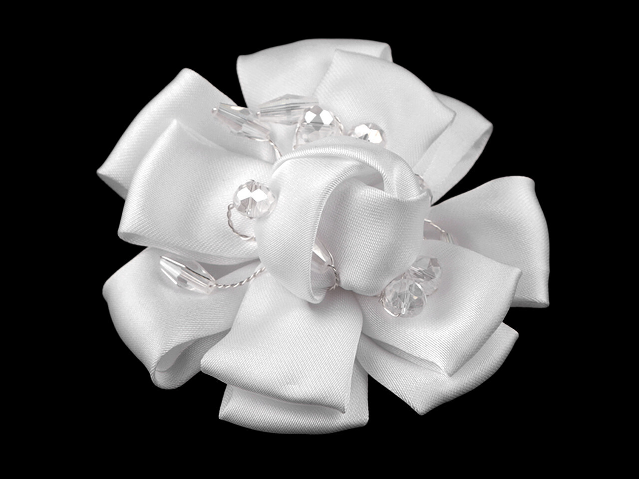 Brož saténový květ s broušenými kamínky Ø7 cm - 1 ks - 4 bílá