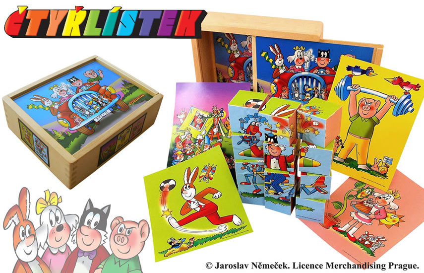 Dřevěné kostky - kubus - 12 kusů v krabičce. Motivy s oblíbenou partou Čtyřlístek. Rozměry balení: 16.50 x 13 cm. Určeno pro děti od 2 let.