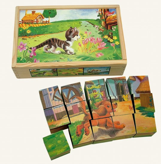 - 15 dřevěných kostek s motivy domácích zvířat