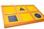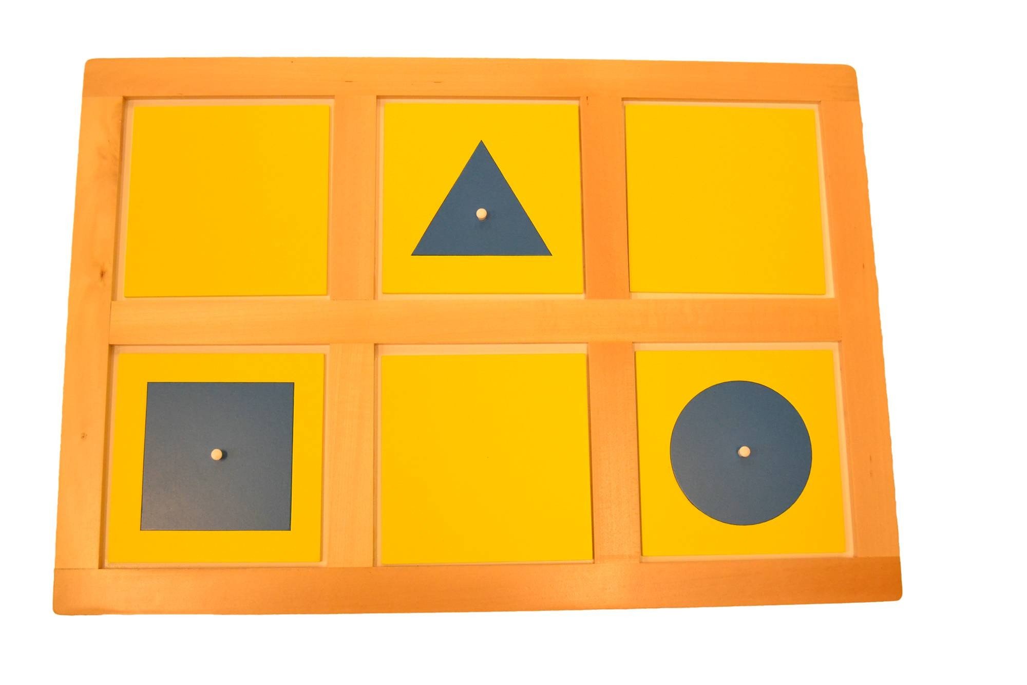 Dřevěný tác (rám) rozdělený na 6 stejných čtvercových polí. V horní řadě jsou 3 modré geometrické tvary s úchytem uprostřed, zasazeny v rámu. Čtverec, rovnostranný trojúhelník a kruh. Spodní 3 pole jsou prázdná.