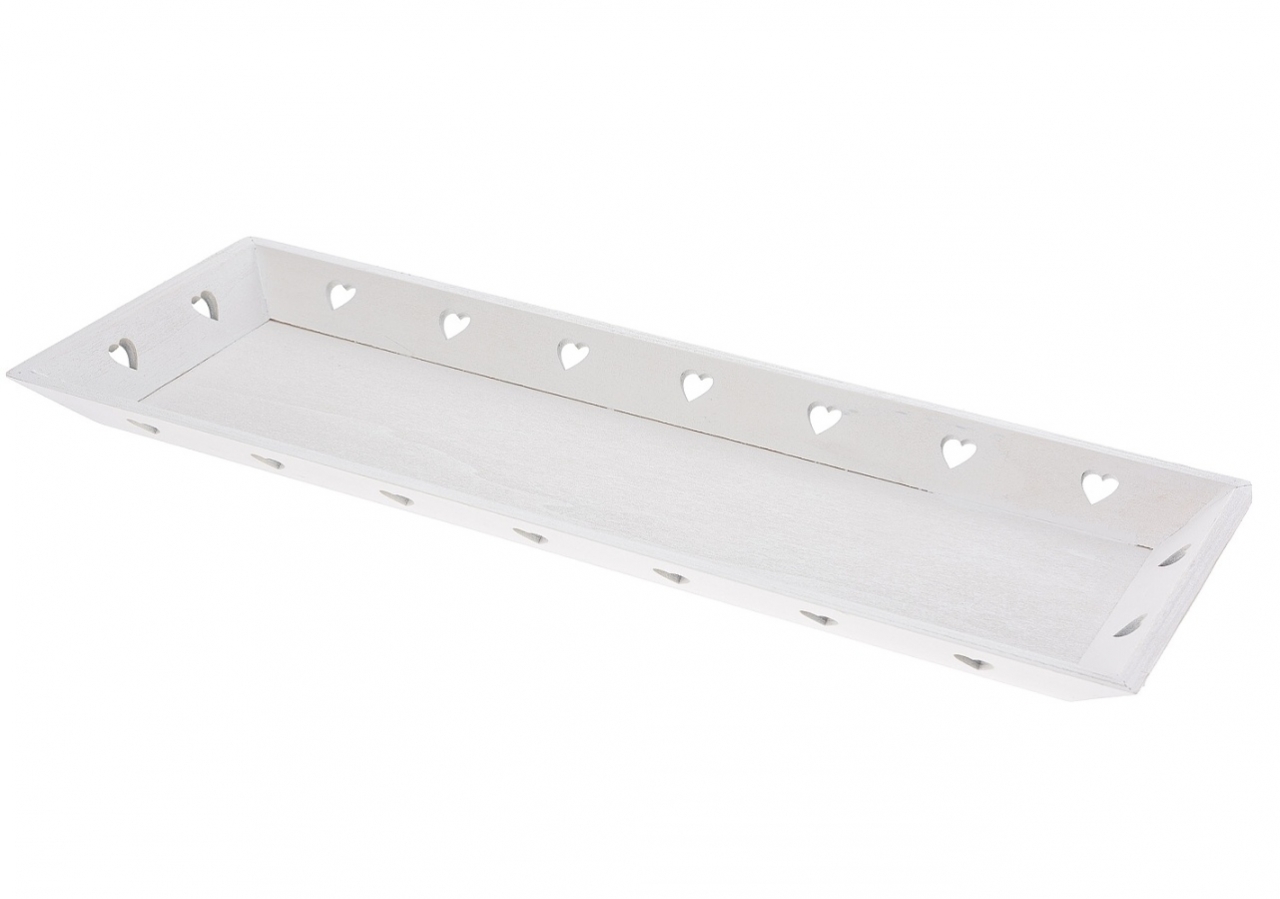 Dřevěný tác s vyřezanými srdíčky. Na tác můžete umístit například LED svíčku, vázu s květinou či jakoukoli jinou věc a v případě nutnosti tác se vším všudy lehce přemístit. Je to univerzální kousek na různé dekorace.