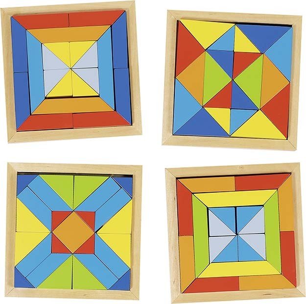 Dřevěná mozaika jsou vlastně rozličné geometrické tvary v rozmanitých barvách uložených do dřevěného rámu. S touto mozaikou je možné si vyhrát dvěmi způsoby - pokud ji chcete využít jako hlavolam, stačí z dřevěného rámu vysypat všechny kostky a seskládat je jako puzzle znovu do rámu a to tak, aby žádná nezbyla. Druhou možností je pak kostky použít na stavění mimo základní desku to zcela dle vlastní fantazie.