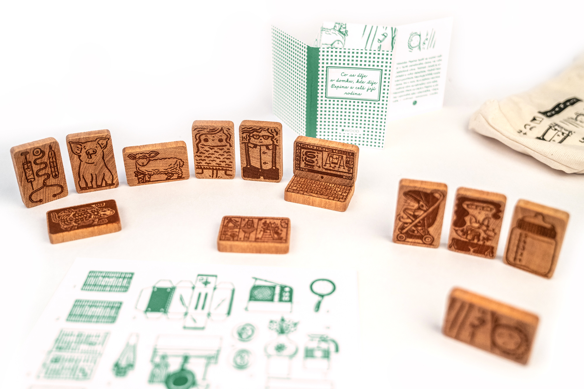 Materiál: kostky jsou vyrobeny z tropického dřeva Jatob, obrázky gravírované, vystřihovánka s miniknížkou z papíru, pytlík ze 100% bavlny