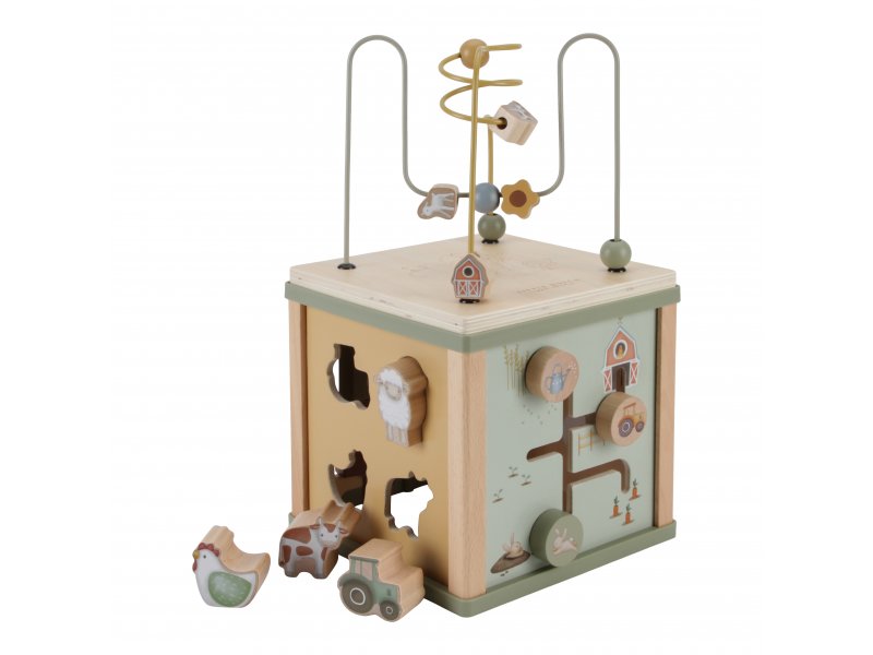Krásná dřevěná kostka s aktivitami a motivy ze života na farmě vzbuzuje u dětí zvědavost a poskytuje jim spoustu zábavy. Jednotlivé strany kostky nabízejí různorodé aktivity - např. třídění tvarů, rotující převody, hádanky či spirály s posuvnými korálky. Hračka pomáhá rozvíjet jemnou motoriku i kreativitu dítěte. Hračka je součástí designové kolekce hraček a doplňků Little Dutch Farma. Vyrobena z kvalitního dřeva pocházejícího z odpovědného lesního hospodaření. Rozměry: 20 x 20 x 40 cm Vhodné pro děti od 18 měsíců.