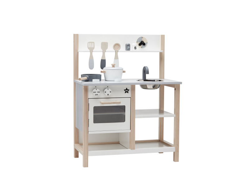 Stylová dřevěná kuchyňka je snem každého malého kuchaře či kuchařky. Součástí kuchyňky je pečící trouba s možností otevření, sporák se dvěma vařiči, hodiny, dřez, hrnce, pánve a další kuchyňské nástroje.