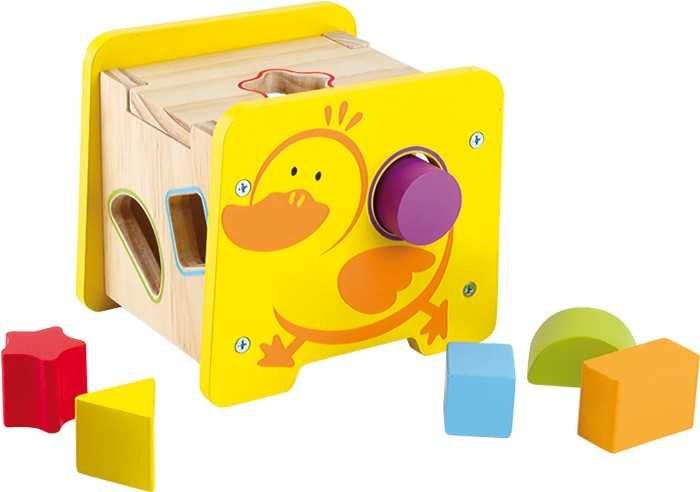 Dvě malé kachny na žlutých bočních dílech vybízejí děti k vyzkoušení hry: Kudy projdou asi nejlépe půlměsíc, obdélník, srdce a jiné tvary? Pomocí této motorické kostky se batolata hravě naučí různé tvary a barvy. Kryt lze otevírat, aby se správně umístěné díly daly zase rychle vyndat.Německá firma Legler zaměřená na výrobu kvalitních dřevěných hraček od roku 1996. Všechny dřevěné hračky značky small foot mají označení CE a jsou vyráběny dle evropské normy pro bezpečnost hraček EN 71. Použité barvy jsou speciálně vyvinuty pro dřevěné hračky a jsou odolné i proti slinám dětí. Dřevo, které se používá pro tyto hračky, většinou pochází z lesnických společností zapojených do zalesňování. To nabízí všem zákazníkům možnost přispět k zachování přirozeně rostoucích lesů. Dřevěné hračky small foot jsou zářivě barevné produkty, které jsou vyrobeny převážně z přírodních surovin - dřeva. Dětem dělají radost od útlého věku, rozvíjí jejich hmatové a smyslové dovednosti. Cílem značky small foot je podporovat duševní a fyzický vývoj dětí.