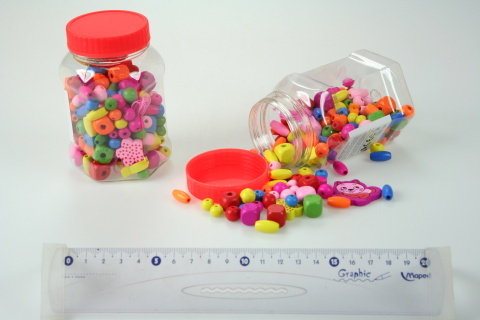 Dřevěné korálky v dóze různých tvarů a velikostí.Dóza 10x6cm.Věk 3+ číst celé