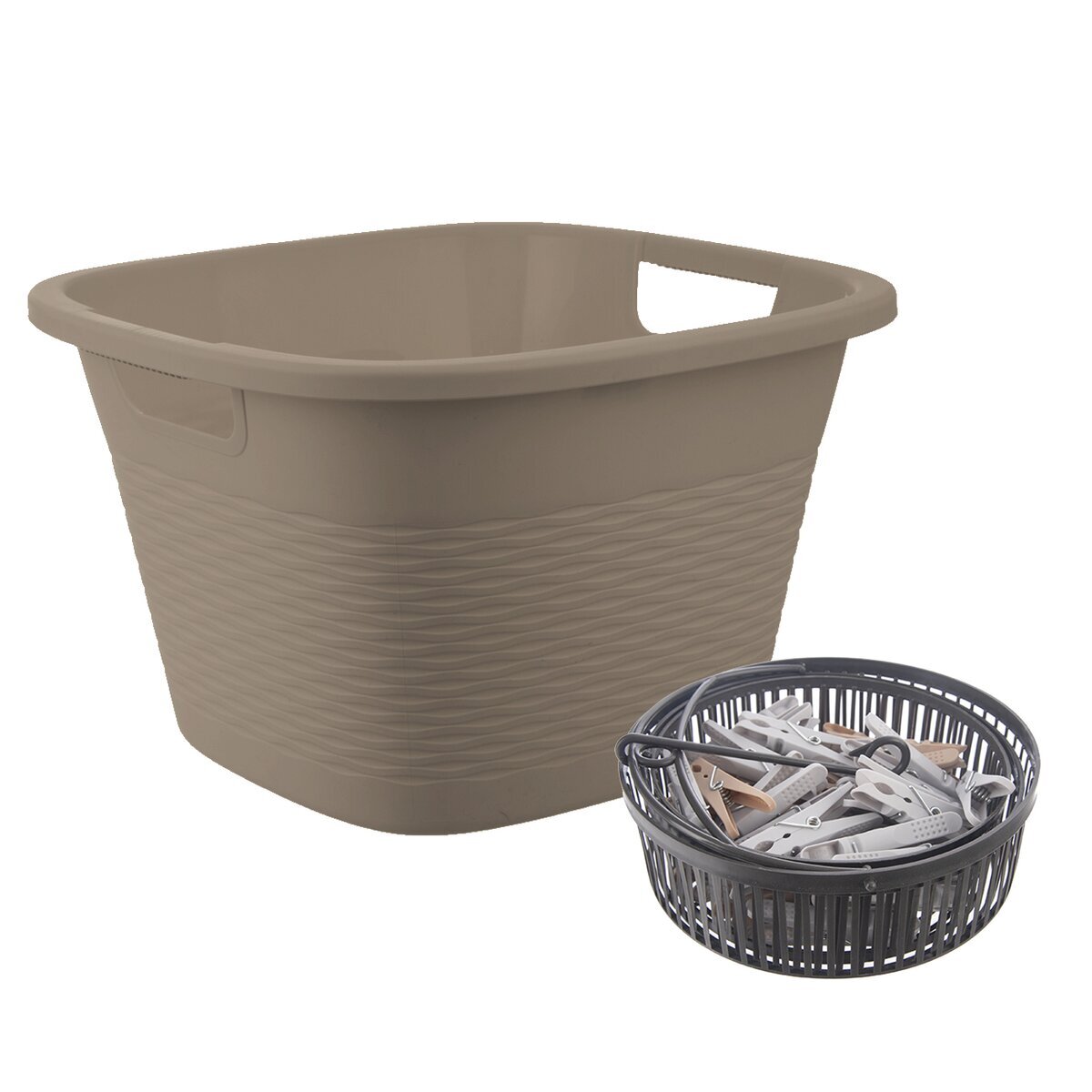 Dřez se dvěma uchy. Materiál: plast. Rozměry: o. 16,8 l, 38x38x24 cm. A pevné prádelní kolíčky, které spolehlivě udrží prádlo na šňůře. Sada 50 ks ve skládacím košíčku, který lze pomocí háčku zavěsit na šňůru nebo sušák a kolíčky jsou tak při věšení prádla pohodlně po ruce. Ve složeném stavu zabere košík s kolíčky jen minimum místa. Kolíčky jsou vhodné na použití uvnitř i na venkovní sušení prádla. Materiál: plast PP, kov. Rozměry: kolíček d. 8 cm, š. 1 cm, košík pr. 20 cm, v. 7/38 cm (složený/zavěšený).