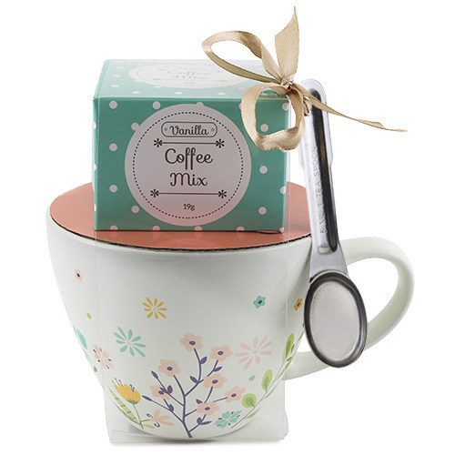 Dárková sada, Vanilková káva 19 g, bílý hrnek s motivem květin, 300 ml, lžička