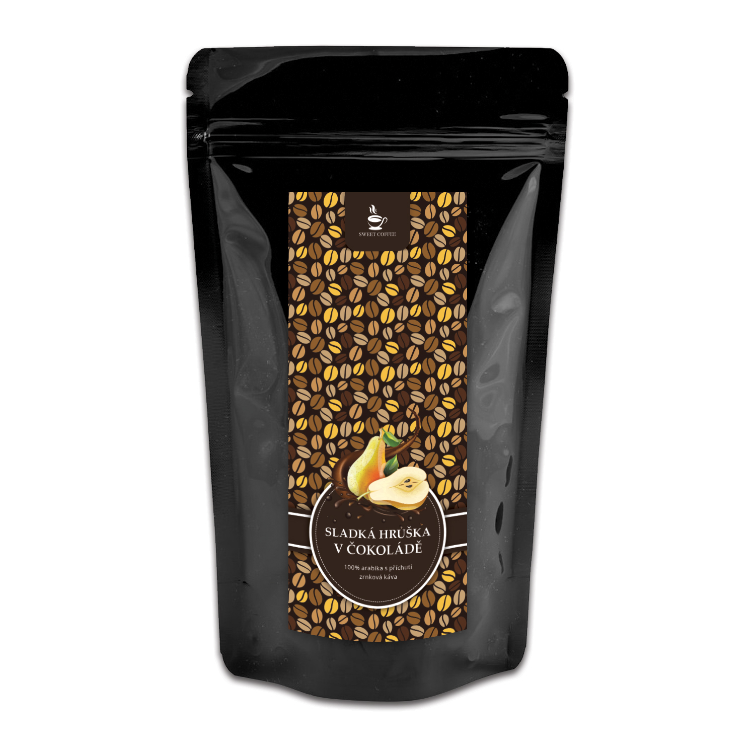 Složení: zrnková káva 100% Arabica, aroma hrušky (2%) a čokolády (2%)