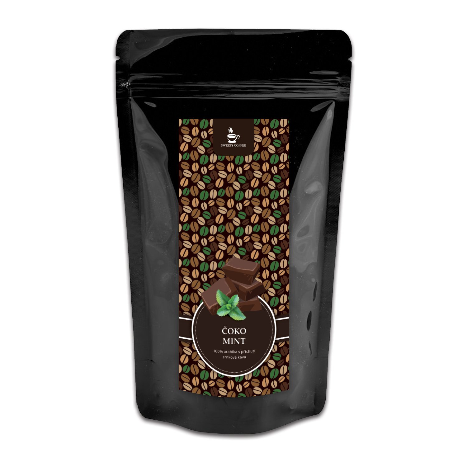 Složení: zrnková káva 100% Arabica, aroma čokolády (3%), aroma máty (1,5%)