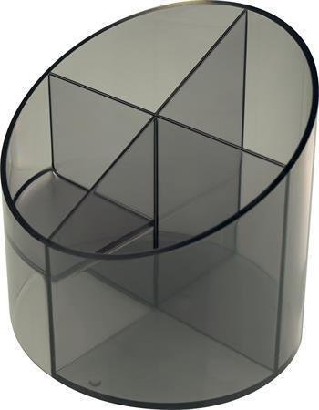 Tento transparentní stojánek v elegantní šedé barvě nabízí čtyři přihrádky různých velikostí, což umožňuje snadné oddělení a uspořádání tužek, propisek, nůžek a dalších kancelářských doplňků. Jeho kompaktní rozměry s průměrem 110 mm a výškou 105 mm zaručují, že nezabere mnoho místa, a přitom poskytne dostatek prostoru na všechny základní psací potřeby.