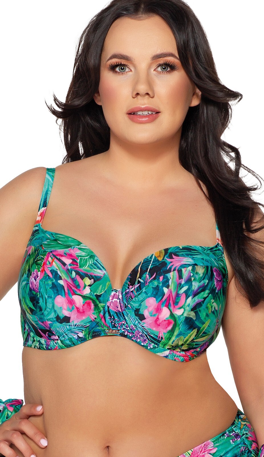 Biustonosz kąpielowy- kolorowa mikrofibra w egzotyczne kwiaty- miseczki usztywnione, typu full cup na fiszbinach- ramiączka nieodpinane, regulowane- obwód zapinany na metalowy klips- idealny komplet z figami SF 205/2