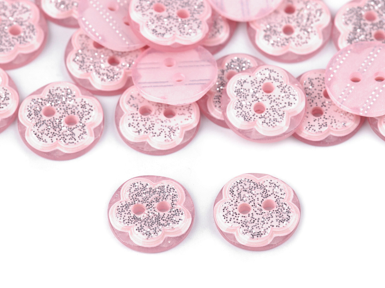 Knoflíky s květem zdobí efektní třpytivé glitry. Ty jsou v knoflíku zafixované, takže nehrozí, že opadají. Knoflíky využijete nejen na oděvy, ale také jimi můžete zkrášlit doplňky jako jsou tašky, čepice, rukavice apod. Jsou vhodné také jako ozdoba k nalepení na foto rámečky, alba, deníky, přáníčka nebo pozvánky.