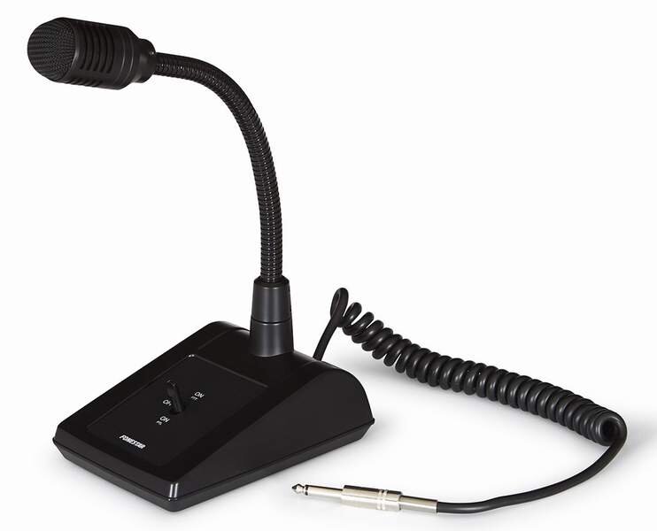 Dynamický mikrofon na husím krku s podstavcem a vypínačem. Celková výška 36cm. 1.5m dlouhý kabel ukončený konektorem jack 6.3mm mono. Vypínač má 3-polohy ON, OFF, fixed ON.