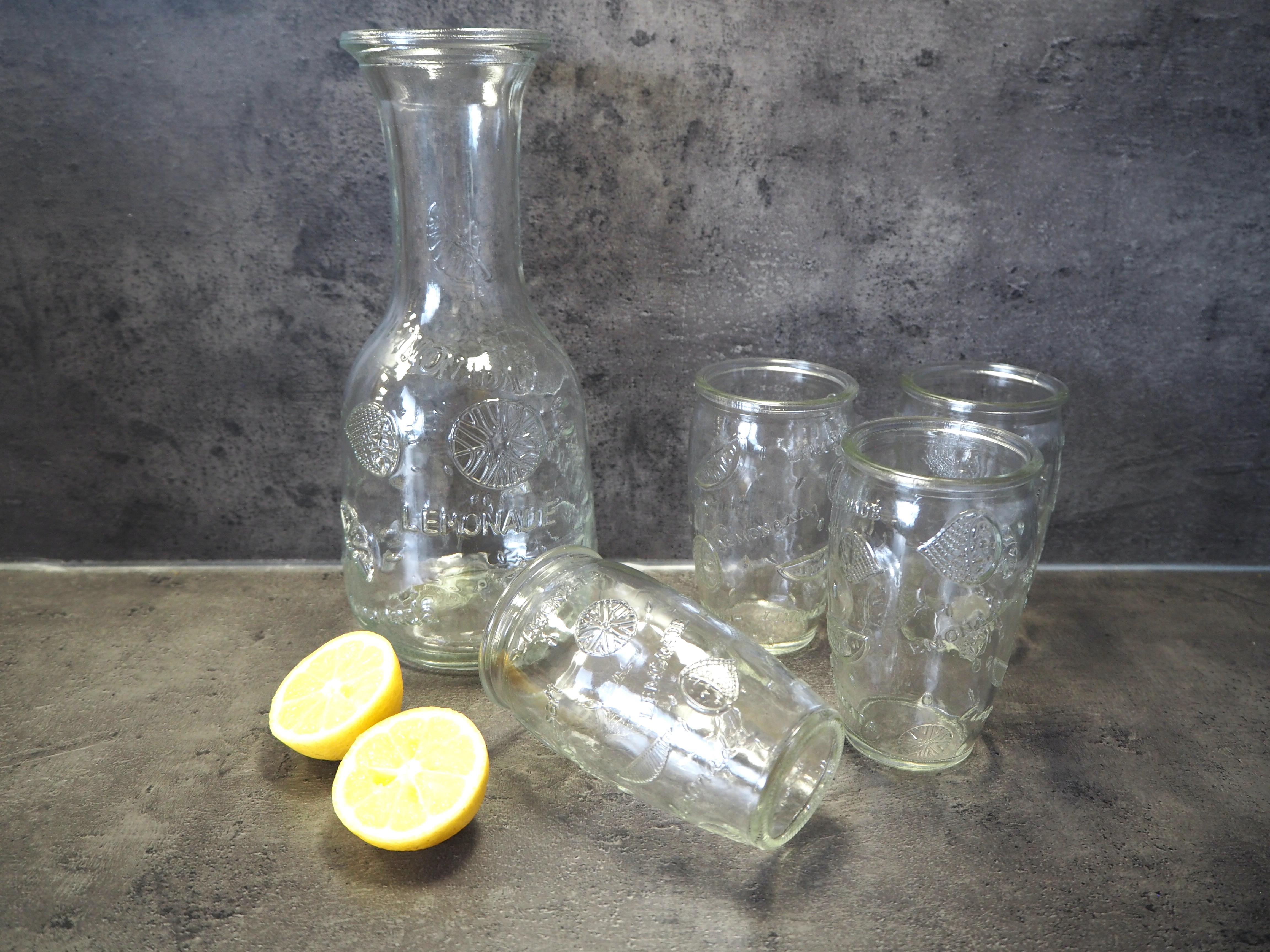 Nádherná sada karafy 1100 ml a 4 skleniček 300 ml ve vintage stylu. Skvěle se budou vyjímat při letním stolování na terase či zahradě. Ideální na letní limonády, citronády, či osvěžující vodu s plátky citrónů a bylinek. Materiál - sklo. Rozměry - karafa: výška 26 cm, průměr 10,5 cm; sklenička:...
