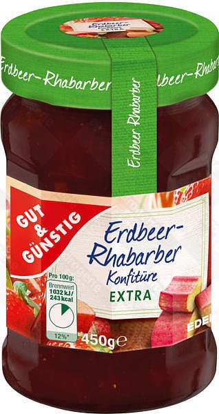 Kvalitní německý džem s podílem ovoce 50% - velké balení 450gr Jahody s Rebarborou Skvělý německý džem s vysokým obsahem kvalitního ovoce, který stojí rozhodně za ochutnání. Výborný je na čerstvý chléb ale i k pečení na promazání perníčku či cukroví. Džem má v sobě kousky ovoce a příjemně želíruje. Balení 450gr ve skleněné lahviSložení: Směs ovoce (25% Jahody, 25% rebarbora), cukr, glukózo-fruktózový sirup, regulátor kyselosti: kyselina citrónová, želírující látka: pektin. Vyrobeno z 50 g ovoce na 100 g. Celkové množství cukru: 60 g na 100 g. Po otevření udržujte v chladu.Průměrná výživová hodnota na 100g:Energetická hodnota kJ/kcal: 1032/243; 12%Tuk: 0,1g;