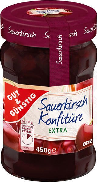 Kvalitní německý džem s podílem ovoce 50% - velké balení 450gr Višňový džem Skvělý německý džem s vysokým obsahem kvalitního ovoce, který stojí rozhodně za ochutnání. Výborný je na čerstvý chléb ale i k pečení na promazání perníčku či cukroví. Džem má v sobě kousky ovoce a příjemně želíruje. Balení 450gr ve skleněné lahviSložení: 50% višně, cukr, glukózo-fruktózový sirup, regulátor kyselosti: kyselina citrónová, želírující látka: pektin. Vyrobeno z 50 g ovoce na 100 g. Celkové množství cukru: 60 g na 100 g. Po otevření udržujte v chladu.Energetická hodnota kJ/kcal: 1032/243; 12%Tuk: 0,3g;