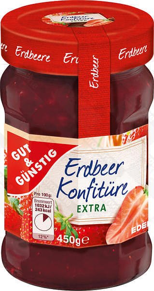 Kvalitní německý džem s podílem ovoce 50% - velké balení 450gr Jahody Skvělý německý džem s vysokým obsahem kvalitního ovoce, který stojí rozhodně za ochutnání. Výborný je na čerstvý chléb ale i k pečení na promazání perníčku či cukroví. Džem má v sobě kousky ovoce a příjemně želíruje. Balení 450gr ve skleněné lahviSložení: 50% jahody, cukr, glukózo-fruktózový sirup, regulátor kyselosti: kyselina citrónová, želírující látka: pektin. Vyrobeno z 50 g ovoce na 100 g. Celkové množství cukru: 60 g na 100 g. Po otevření udržujte v chladu.Energetická hodnota kJ/kcal: 1032/243; 12%Tuk: 0,2g;