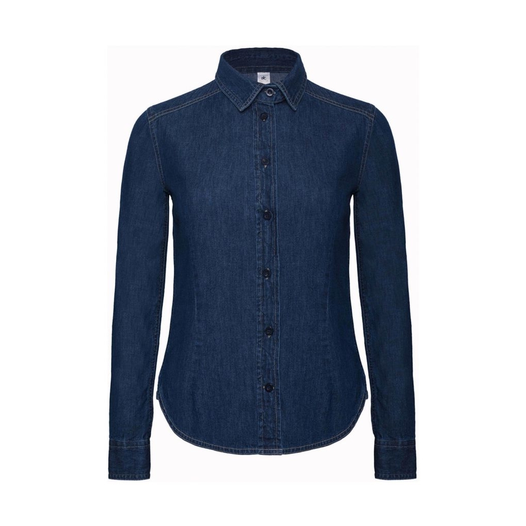 Stylová dámská džínová košile od firmy B&C. Má límec s měkkým lemováním, na zadní straně límce ozdobné prošití v barvě košile, napůl skrytou légu s knoflíky ve stejné barvě, trojité ozdobné prošití na krku a prsou. číst celé