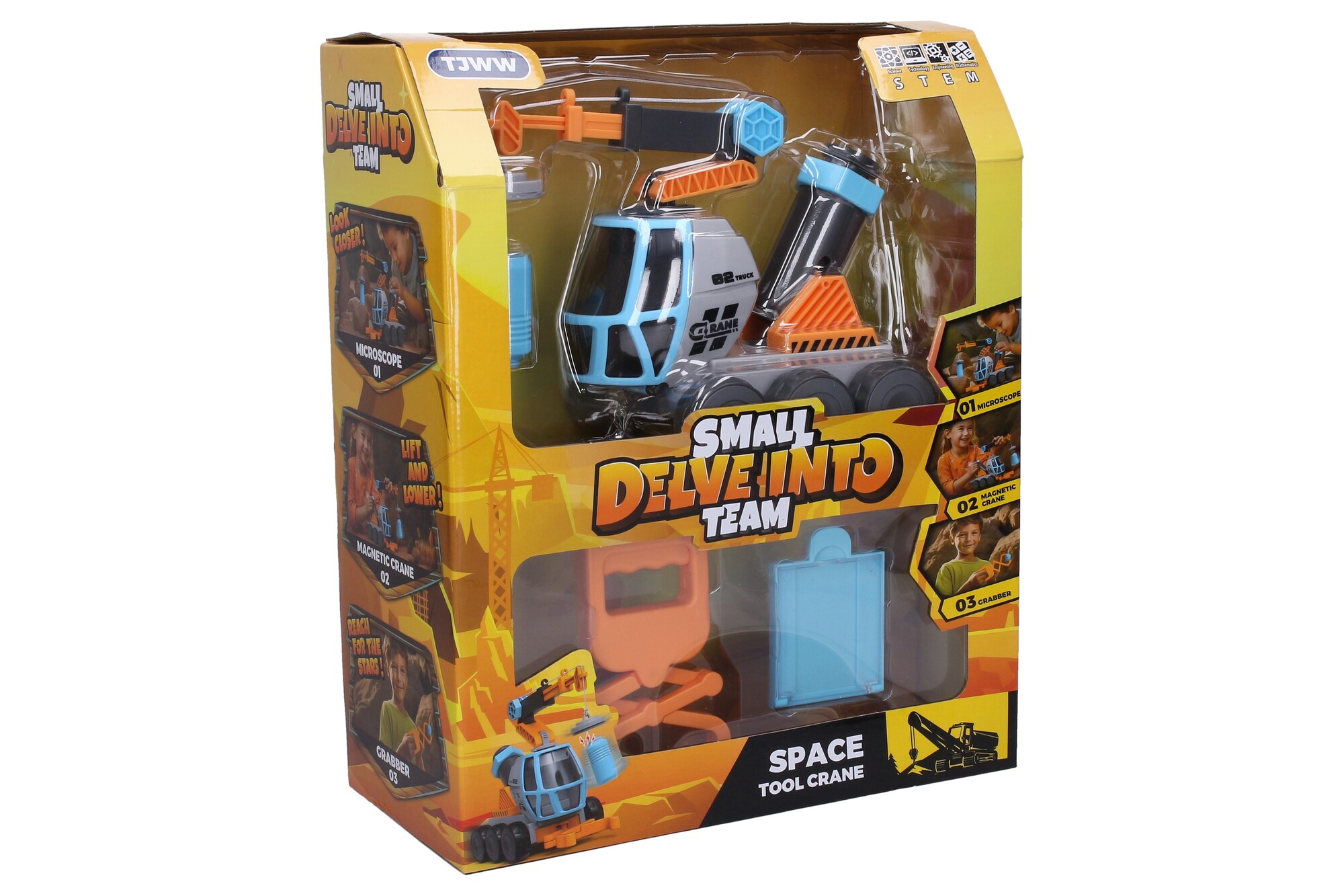 Vědecká sada jeřáb 4v1. Rozměry jeřábu 20x11x18 cm. Teleskopické rameno s magnetem, mikroskop, prodloužená ruka, úložný prostor. 3xAG10 baterie nejsou součástí. Tlačítko v zadní části jeřábu.