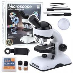 MIKROSKOP EDUKACYJNY Z UCHWYTEM NA TELEFON I ZESTAWEM AKCESORIÓW Niezwykły mikroskop edukacyjny to idealne narzędzie dla młodych odkrywców i pasjonatów nauki. Oferuje trzy poziomy powiększenia - 200x, 600x oraz aż 1200x, dzięki czemu umożliwia precyzyjne badanie mikroskopijnych struktur i detali niewidocznych gołym okiem. To kompletne laboratorium w zasięgu ręki, które pozwala na eksplorowanie fascynującego mikroświata. Wbudowane światło dolne LED umożliwia podświetlanie przezroczystych preparatów, natomiast górne światło LED pozwala na obserwację nieprzezroczystych obiektów. Zastosowane kolorowe filtry świetlne dodatkowo zwiększają komfort i atrakcyjność obserwacji. W zestawie znajduje się również specjalny uchwyt na telefon, który umożliwia montaż smartfona nad okular mikroskopu - pozwala to na robienie zdjęć preparatów oraz dzielenie się obserwacjami z innymi. Dodatkowe akcesoria - w tym pincety, szkiełka, próbki i narzędzia laboratoryjne - zapewniają pełną gotowość do pierwszych eksperymentów. Zaprojektowany z myślą o dzieciach i początkujących badaczach, mikroskop jest łatwy w obsłudze, solidny i inspirujący, idealny do nauki biologii, chemii, fizyki czy po prostu odkrywania otaczającego świata w skali mikro. SPECYFIKACJA: Typ urządzenia: mikroskop edukacyjny Powiększenia: 200x, 600x, 1200x Oświetlenie: LED dolne i górne Filtry: kolorowe, podświetlenie dolne Zasilanie: 2 x bateria AA 1,5V (brak w zestawie) Wymiary opakowania: 29 x 25,5 x 11 cm Materiał: tworzywo sztuczne + elementy optyczne ZAWARTOŚĆ ZESTAWU: 1 x mikroskop edukacyjny 1 x uchwyt na telefon 2 x pojemniczki na próbki 1 x pudełko z narzędziami 12-elementowe 1 x pinceta 1 x igła preparacyjna 1 x szpatułka 1 x szkiełka 1 x pojemniczek laboratoryjny