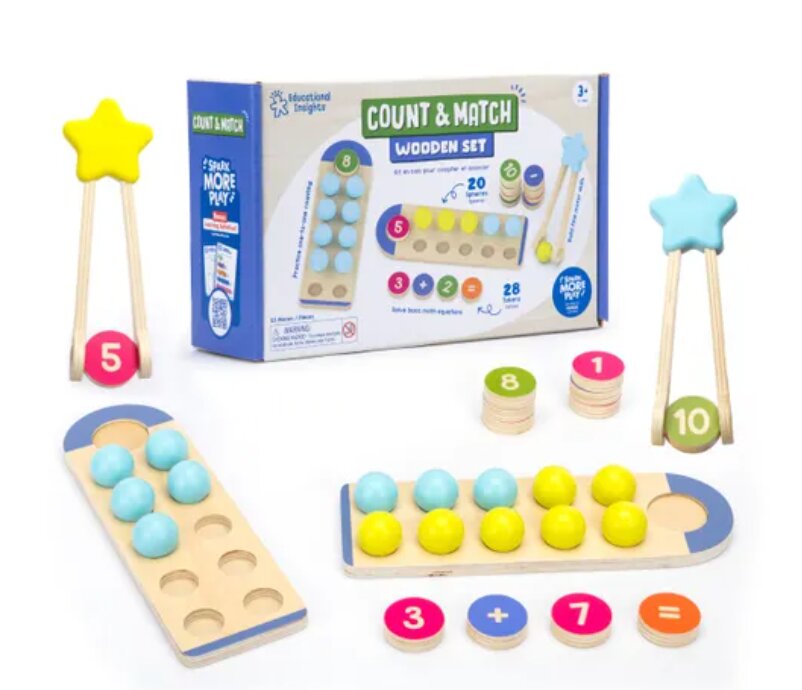 Dřevěný set Count & Match Numbers 1–10 propojuje zábavné počítání s jemnou motorikou – ideální pro první matematické kroky dětí od 3 let.