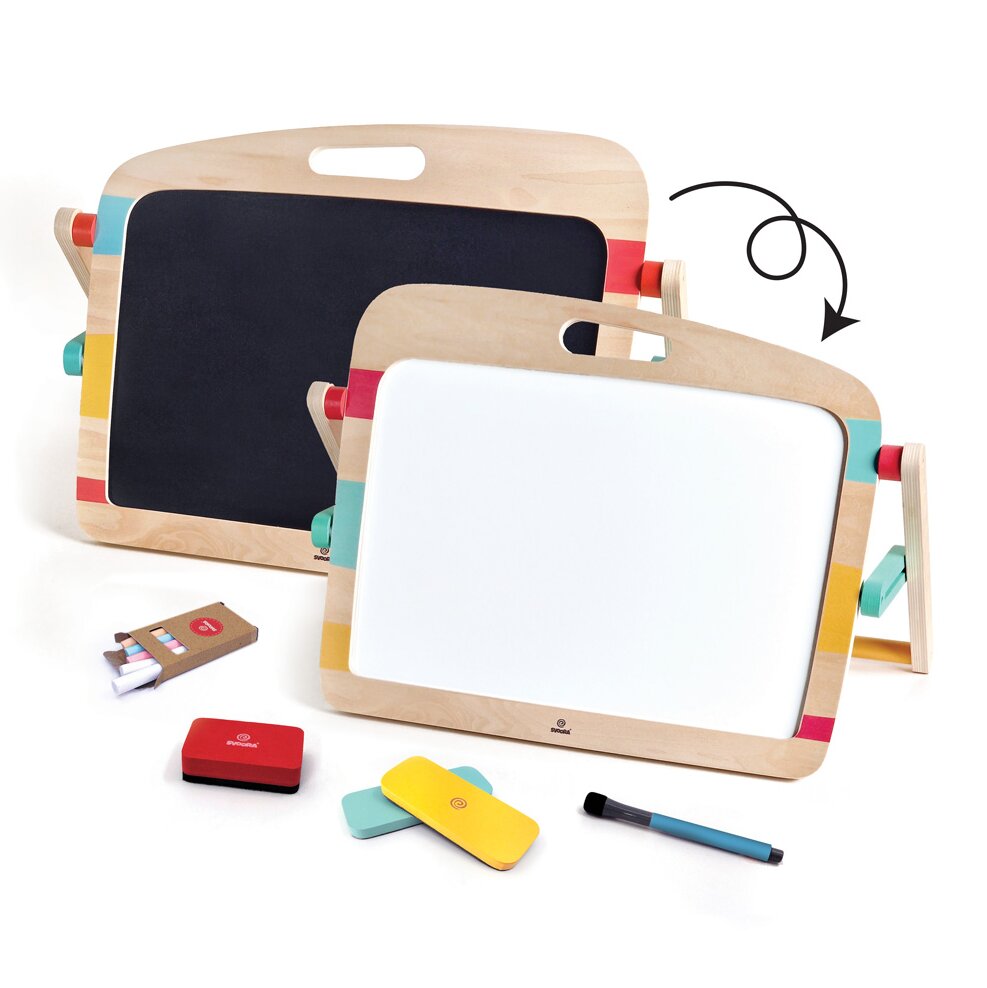 Zábavná hračka pro zábavné chvíle: Oboustranný stojan s tabulí a magnetickou tabulí! Kresli, obracej a zase kresli! Černá tabule nabízí možnost neomezeného tvoření křídami, zatímco magnetická bílá tabule je výzvou k nejlepším malbám fixem!