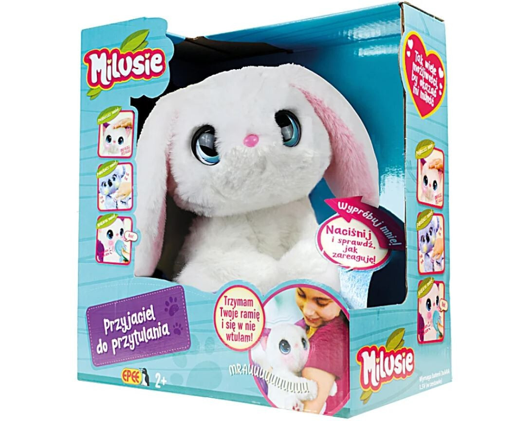 Milusie to niezwykli, pluszowi przyjaciele. Chwytają ramię dziecka łapkami. Przytulają się i poruszają główką, zupełnie jak prawdziwe zwierzątka. Wydają zabawne dźwięki, a ich policzki rozświetlają się wieloma kolorami. Oferują ponad 50 różnych reakcji.