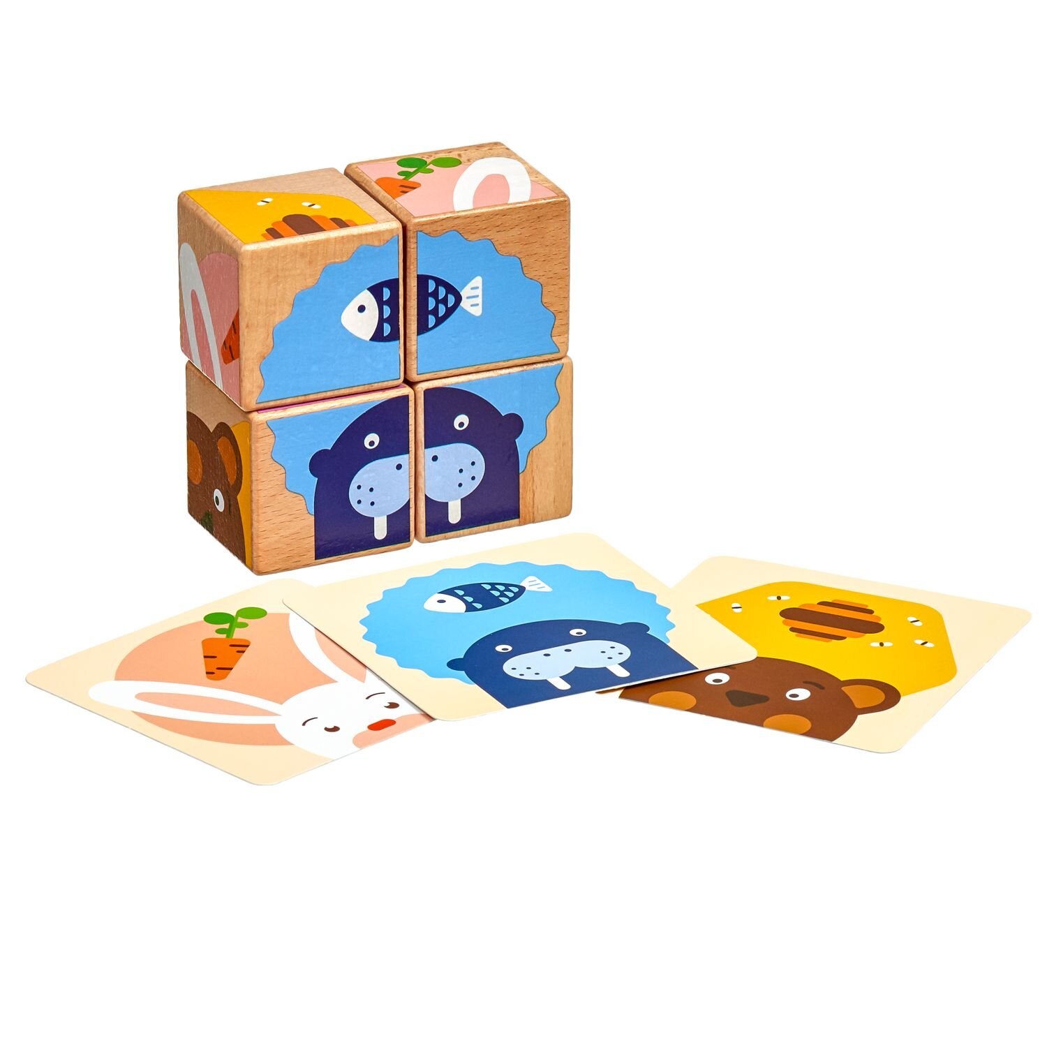 Co zvířátka jedí jsou dřevěné skládací obrázkové kostky s předlohami, ze kterých je možné složit 6 různých obrázků se zvířátky a jejich pamlsky. Hra byla vytvořena především pro malé děti, které začínají skládat své první obrázky. Tomu odpovídá i počet kostek a grafické zpracování. Hra dětem pomáhá procvičit si znalost barev a podporuje motorické schopnosti, obratnost a logické myšlení. Rozměr kostek 4,5 x 4,5 x 4,5 cm.