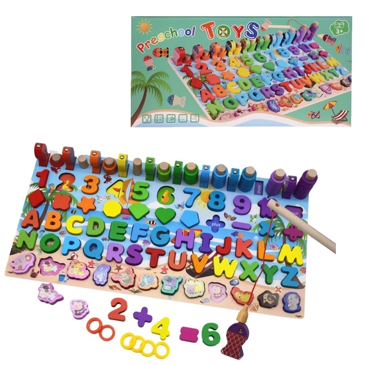 Zábavné učení se písmen a číslic. Když tě to přestane bavit, zahraj se buď chytáním rybek nebo vkládáním zvířátek do správných políček. Dřevěná hra pro rozvíjení logického myšlení, jemné motoriky a kreativity.