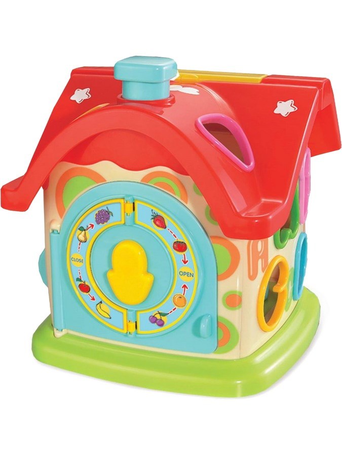 Zábavný barevný dětský domeček Baby Mix. Tato dětská edukační hračka pomáhá zlepšit manuální zručnost a obratnost, učí dítě rozpoznat tvary, zvuky a barvy, zapojuje a rozvíjí smysl pro pozorování. Domeček nabízí mnoho možností ke hraní, vydává zvuky. Hračka má hodiny, komínek, který po stisknutí píská, počítadlo, otvory do kterých se vkládají kostky, válec s obrázky, ozubené kolečka. Určeno pro děti od 18 měsíců. Rozměry: šxv cca 21x17 cm.