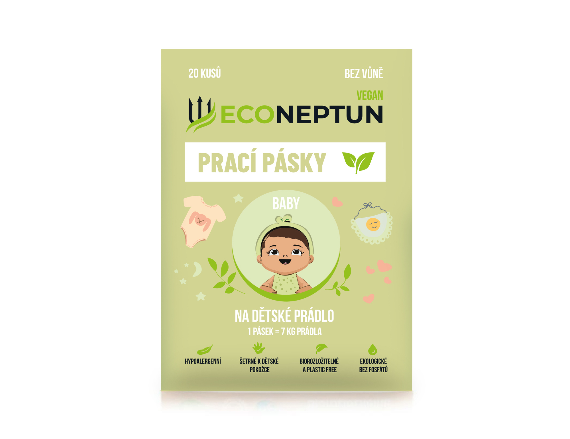 Už nikdy nebude praní dětského prádla tak snadné a ekologické! Naše Baby Prací Pásky EcoNeptun jsou skvělým společníkem pro rodiče, kteří chtějí pro své nejmenší to nejlepší. Bez chemie, parabenů, fosfátů, SLS a alergenů jsou tyto prací pásky vhodné i pro citlivou pokožku miminek.