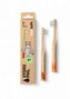 Kartáček s extra měkkými štětinkami poskytne jemnou péči dětským zoubkům, a tom i těm s fixními rovnátky. Je BPA-free a velikost hlavy kartáčku je akorát tak vhodná pro prcky od 3 let. Vyroben je z obnovitelných zdrojů - má bambusové tělo, štětinky z ricinového oleje a nenajdete v něm ani kapku ropných složek. Do obalu z recyklovaného papíru v Hydrophilu ukryli hned 2 kousky za velmi příjemnou cenu. Vybrat si můžete ze 2 oku libých designů - hrošího s oranžově zbarveným koncem nebo vydřího s modrým.. Milovníci oranžové, zbystřete. Barva spodní části kartáčku na produktovém foto úplně neodpovídá realitě. Jedná se spíše o cihlovou červeno-hnědou než oranžovou. Nejlépe se nám barvu podařilo nafotit na fotce ze skladu.