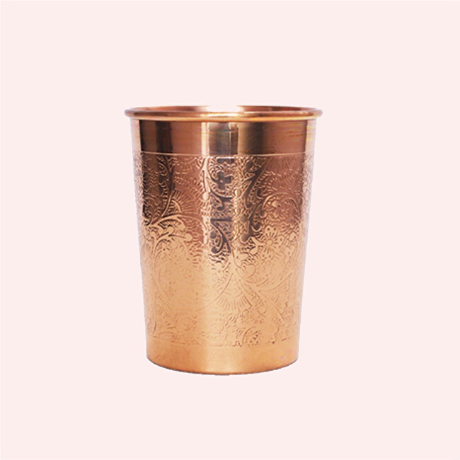 Měděný hrnek s rytým ornamentem je součástí ryté kolekce a zobrazuje bohaté dědictví a umělecké řemeslo, které se v Indii praktikuje po generace. Naservírujte svým hostům vodu jako v majestátním indickém paláci! Měděné nádobí je lehčí než skleněné nebo ocelové a ekologičtější než plastové. Pokud je o nádobí dobře postaráno, může být ponecháno jako něco vzácného a plného vitality pro další generaci. Ajurvéda už od pradávna obhajovala výhody pití měděné vody. Když podle ní vodu skladujete v měděné nádobě po dobu 4-12 hodin (ideálně pak přes noc), voda se stane přirozeně alkalickou. To se děje proto, že měděná nádoba pozitivně nabíjí vodu a dodává jí energii, voda začně tzv. 'znovu žít'. Nabitá měděná voda pak pomáhá přivést do těla rovnováhu. V ájurvédě se tato přeměněná terapeutická voda odebraná z měděných nádob nazývá „Tamra Jal“. Jak používat: