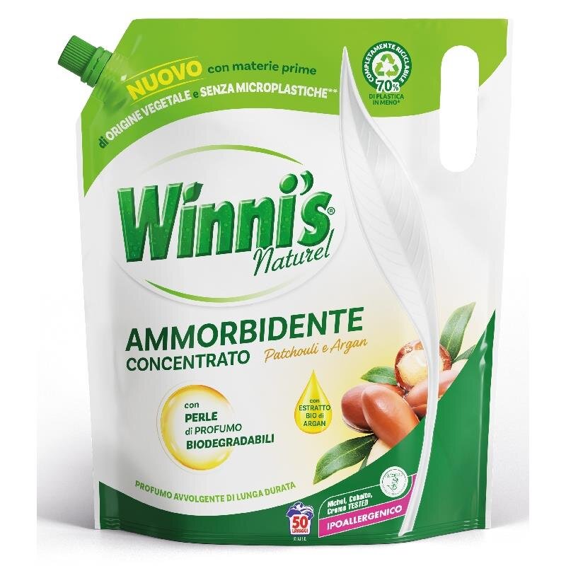 Koncentrovaná aviváž - Winnis Argan 50 pracích dávek Ekologická náplň na 50 dávekVůně: pačuli a arganSe surovinami rostlinného původuS biologicky odbouratelnými parfémovými perlamiUdělejte své oblečení neuvěřitelně měkké a voňavé s koncentrovanou avivážou Winni\'s Naturel! Aviváž Winni\'s, vyrobená ze surovin rostlinného původu z obnovitelných zdrojů a bez mikroplastů, uvolňuje tkaniny a redukuje zbytky vodního kamene, které se tvoří uvnitř vláken, čímž usnadňuje žehlení. Díky přídavku biologicky odbouratelných parfémových perel a organického arganového extraktu dodává tato aviváž oděvům svěží, dlouhotrvající pačuli a arganovou vůni. Navíc je hypoalergenní, testovaný na nikl, chrom a kobalt a v praktické náplni v sáčku je ještě udržitelnější!