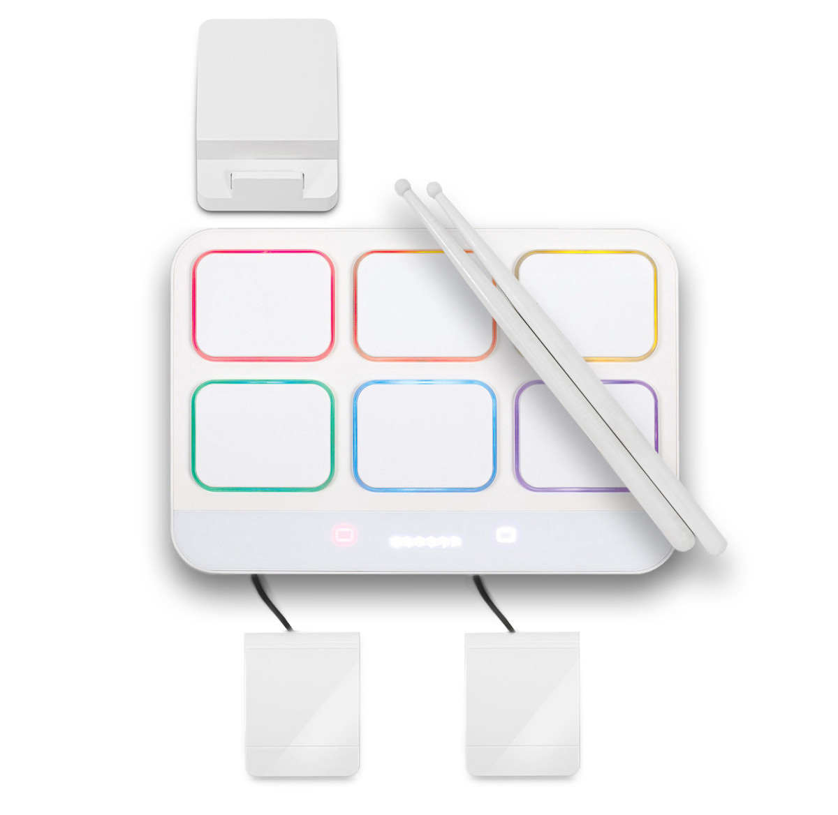 Doprodej skladových zásob! Podpora pro iPad Air, iPad s Retinou, iPad (2., 3., 4. generace) a iPad mini (1. generace) a iOS 9.3.5 už byla bohužel ukončena a není k dispozici ke stažení ani aplikace CUBEAT APP pro iPad na App Store s výukovými lekcemi. Aktuálně lze CUBEAT připojit k PC jako běžné MIDI zařízení, které je možné využít v některém z dostupných hudebních programů (podobně jako klávesy, mikrofon apod.). Kontrolér má šest padů se svítícím lemováním, dále jsou součástí balení dva pedály pro velký buben a hi-hat, pár paliček, stolní držák pro iPad, kabely Dock - iPad, Dock - USB a USB pro napájení. Vše v atraktivní lesklé bílé barvě. V kontroléru je vestavěná nabíjecí baterie s LED kontrolkou stavu nabití. Software a USB napájecí adaptér nejsou součástí dodávky.