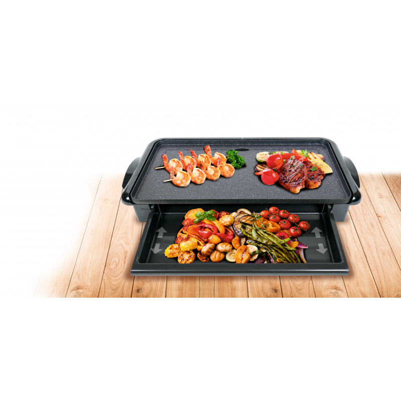 Elektrický granitový Gril, s výsuvným a vyjímatelným podnosem pro zapékání sýrů, zeleniny apod. a tepelné udržování již ugrilovaných pokrmů apod.. Velká granitová grilovací deska o velikosti 46 x 26 cm. Příkon: 2000 W