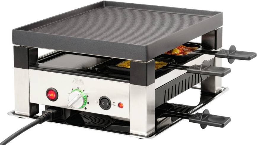 - Unikátní nepřilnavý povrch Whitford Xylan - Snadno se čistí, lze jej mýt v myčce nádobí - Tělo z nerezové oceli - Plynulé nastavení teploty, světelný indikátor připravenosti - Oboustranná grilovací plocha (hladká a rýhovaná / pro pánve a mini palačinky) - Spodní ohřev na 80 °C - Studená zóna pro odkládání pánví - 900W výkon grilu a 120W spodní ohřev - Součástí balení: 4x nepřilnavá pánvička na raclette, 4x nepřilnavá špachtle, 4x nepřilnavá mini pánev wok - Rozměry výrobku: 33x16x27cm - Průměr mini palačinkových kroužků: 11 cm - Odnímatelný síťový kabel