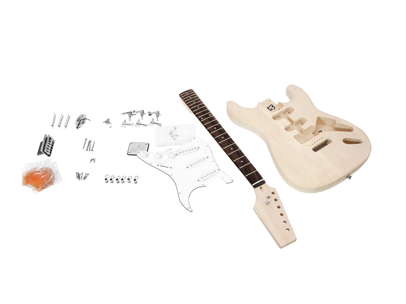 Kytarová stavebnice typu Strat s kompletní sadou montážních prvků a předmontovanou elektronikou. Tělo lípa, šroubovaný krk javor, menzura 648 mm, hmatník blackwood, 22 pražců, kobylka klasické tremolo typu Strat, chromovaná mechanika, 3x jednocívkový snímač (single coil), 1x ovládání hlasitosti, 2x ovládání tónu, 5-ti polohový přepínač. Součástí dodávky sada strun 009-042. Bez povrchové úpravy - připraveno k lakování.