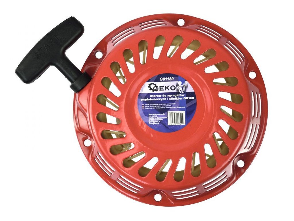 Startér k motoru GX160 GEKONový náhradní startér pro většinu čtyřtaktních benzinových motorů, pasuje do většiny strojů a zařízení např. do motorů Honda (GX160) a jiné.. Nejčastěji se používají v generátorech, vibračních deskách, čerpadlech, frézách...celkový průměr startéru cca 175mmupevnění... číst celé