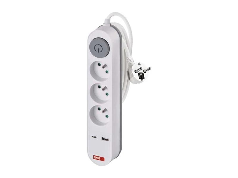 Prodlužovací kabel 2 m / 3 zásuvky / s vypínačem / bílý / 1×USB-A + 1×USB-C / 1,5 mm2. Prodlužovací přívod s vypínačem. 250V~/16A max. 3 zásuvky s dětskými clonkami. USB A+C 3,4 A, 17 W max. Délka přívodního kabelu 2 m. Vodič H05VV-F3G 1,5mm2. Výhody produktu: