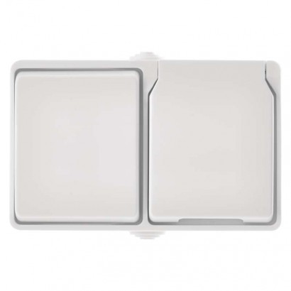 barva: bílá (matná)|design: FRENCH|krytí: IP44|prodejní obal: 1 ks, PE sáček|produkt: kombinace přepínače střídavého č. 6 a zásuvky jednonásobné s ochranným kolíkem a víčkem|provedení: 2 nás. voděodolné - 1× zásuvka + 1× přepínač střídavý|typ: zásuvka 250 V~/16 A max.; přepínač 250V~, 10AX|způsob...