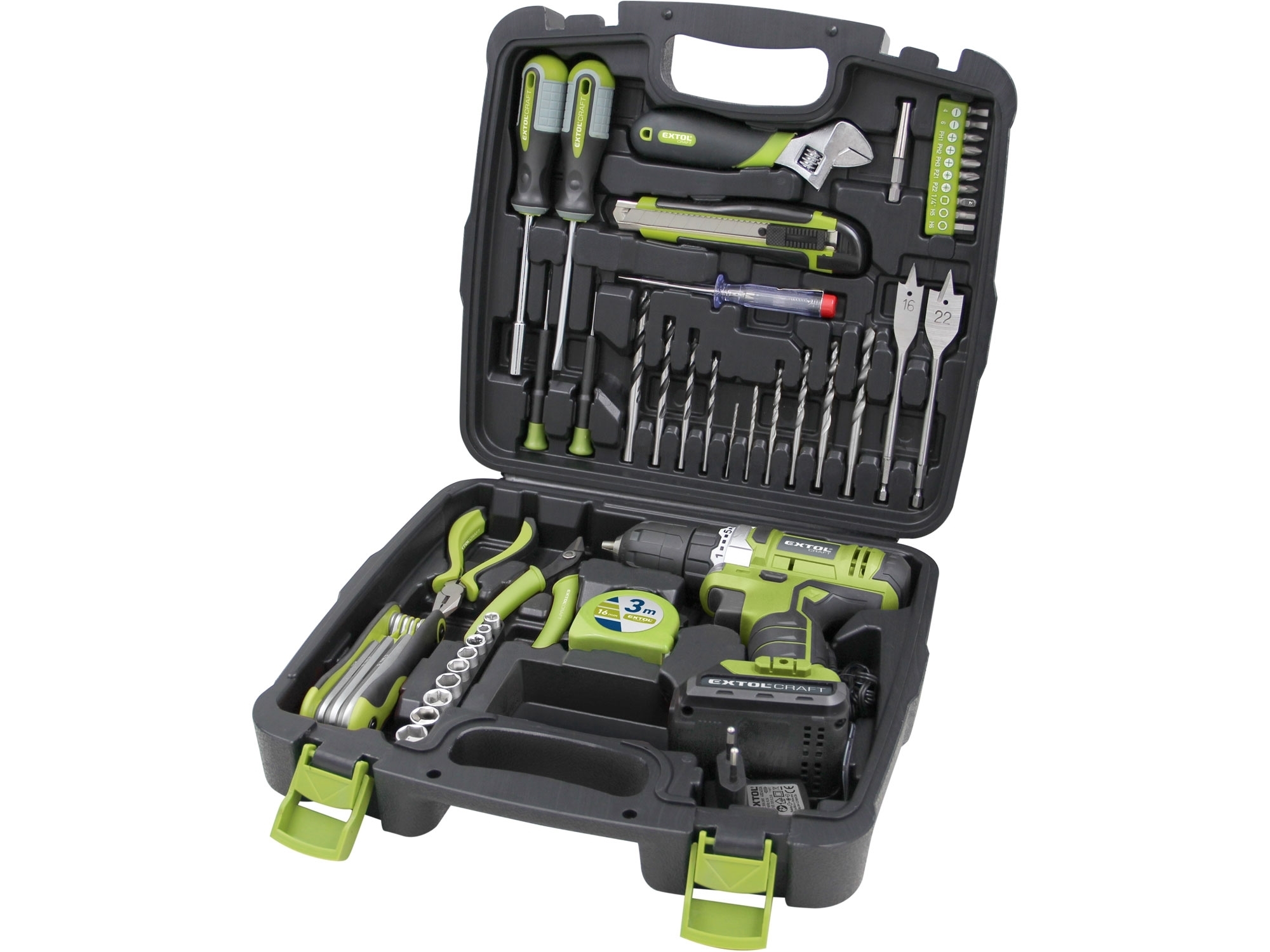 Praktická sada pro domácnost obsahující aku vrtací šroubovák s vrtáky a bity a základní nářadí. Lehký vrtací aku šroubovák je určen k dotahování a povolování šroubů či vrutů, dále k vrtání do dřeva, kovu a plastů. Díky Li-ion akumulátoru je možné šroubovák kdykoliv dobíjet, aniž by se tím snižovala kapacita akumulátoru. Li-ion akumulátor ztrácí energii vlivem samovybíjení velmi pomalu a vydrží dlouho nabitý.