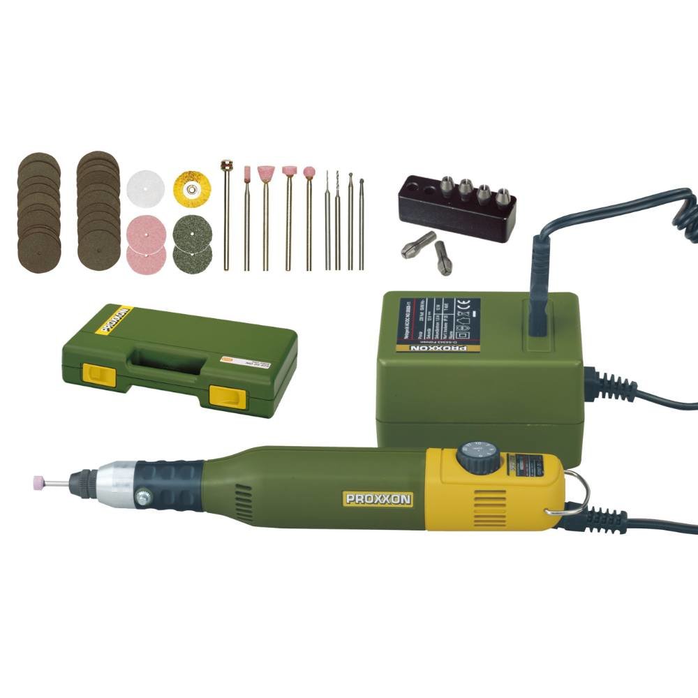 Kompletní modelářská sada Proxxon na vrtání, kartáčování, čištění, frézování, broušení, leštění,odrezování, řezání, gravírování a cizelování. Vhodné zejména na opracování skla, keramiky, oceli, ušlechtilých kovů, plastů a minerálů. Pro elektroniku, modelářství, jemnou mechaniku, šperkařství, optiku, umělecká řemesla, výrobu nářadí a forem. Stabilní tělo z polyamidu se skelnými vlákny. Změkčená úchopová část. Vyvážený, silný, tichý elektromotor. Plynulá regulace otáček se zpětnovazební regulací (vysoká záběrová síla i ve spodním rozsahu otáček ). . Doporučený napájecí síťový zdroj 12V, 1A.