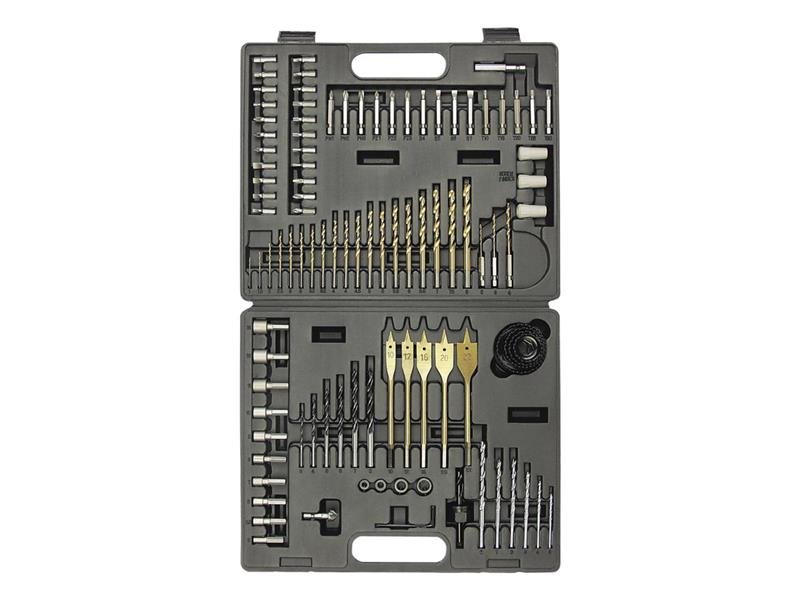 10 nástrčných klíčů, chrom-vanadiová ocel se šestihrannou stopkou: (5, 5,5, 6, 7, 8, 9, 10, 11, 12, 13mm) 19 vrtáků HSS, s titanovou vrstvou: 1/1,5/2/2,5/2x 3/3,2/3,5/2x 4/4,5/2x 5/5,5/6/6,5/7/7,5/8mm 5 plochých vrtáků do dřeva, s titanovou vrstvou se šestihrannou stopkou: 10/12/16/20/22mm 6 vrtáků do dřeva 3/4/5/6/7mm 1 záhlubník 4 hloubkové dorazy Klíč s vnitřním šestihranem 2,5 mm 6 vrtáků do kamene, osazené tvrdokovem: 3/4/5/6/7/8mm Adaptér pro děrování s centrálním vrtákem 4 děrovky 32/38/44/54mm 3 vrtáky HSS se šestihrannou rychloupínací hlavičkou, s titanovou vrstvou: 2/3/4mm 3 pomůcky na šrouby pro dlouhé bity