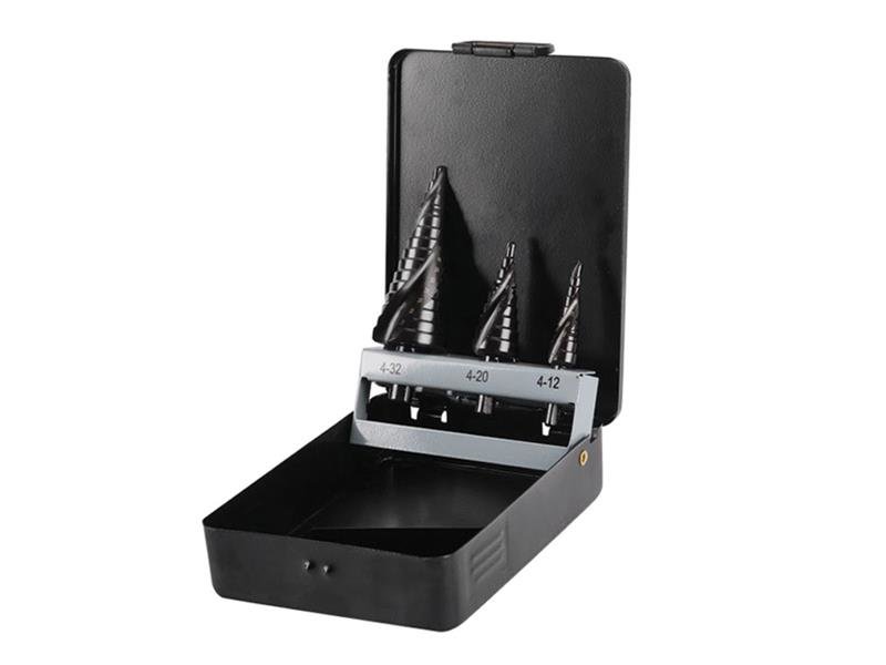 Stupňovité vrtáky se používají pro vrtání kruhových otvorů v slitinových i neslitinových ocelových plátech, trubkách a profilech do tloušťky stěny 4mm, k navrtávání a odhrotování v jedné pracovní operaci. Lze je použít také pro vrtání do měkčích materiálů, např. dřeva, plastů a plexiskla. Kuželový vrták je určen pro plynulé a bezhrotové vrtání a navrtávání otvorů bez deformace plechu. Vrtáky je možné znovu naostřit. Lamač třísek k odhrotování a začištění hran po vrtání, použití na měkkou ocel nebo plast. ∅ 4-12/1mm, ∅4-20/2mm, ∅4-32/2mm