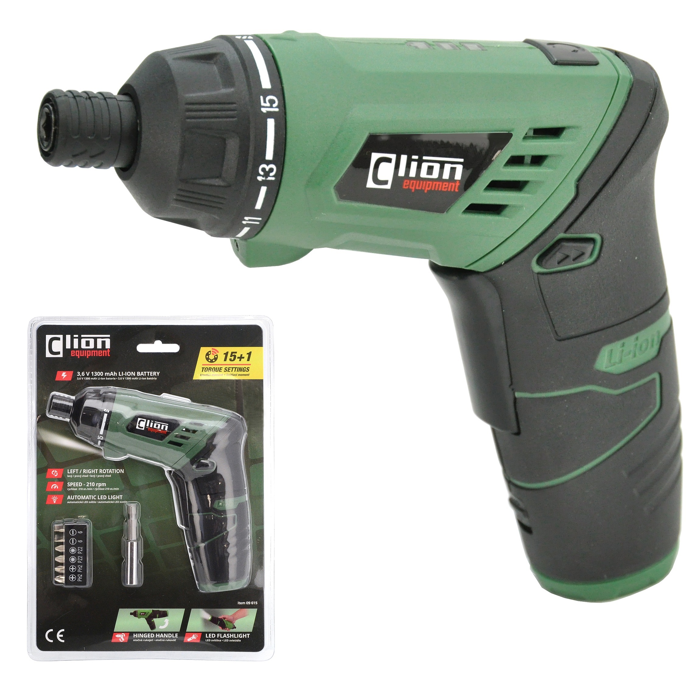 Kompaktní akumulátorový šroubovák C-LION equipment 3,6 V dodáván spolu s nabíječkou, prodlužovacím nástavcem a dalším příslušenstvím.