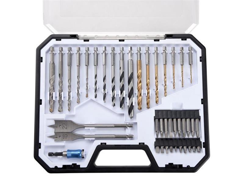 Obsah: vrtáky do kovu: 2-2,5-3-4-5-6-8mm, vrtáky do dřeva: 4-5-6-8-10mm, vrtáky ploché do dřeva: 16-22mm, vrtáky do zdiva: 4-5-6-8-10mm, hroty 1/4"x 25mm (-)4-5,5-7mm, PH1-3, PZ1-3, HEX4-5-6mm, hroty 1/4"x50mm (-)4-5-6-7mm, PH1-2-3, PZ1-2-3, držák hrotů